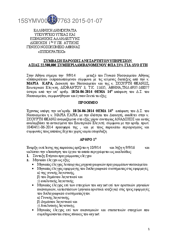 1. ΣΥΜΒΑΣΗ ΠΑΡΟΧΗΣ ΑΝΕΞΑΡΤΗΤΩΝ ΥΠΗΡΕΣΙΩΝ ΑΞΙΑΣ 22500ΕΥΡΩ ΣΥΜ/ΝΟΥ ΦΠΑ ΓΙΑ ΔΥΟ ΕΤΗ