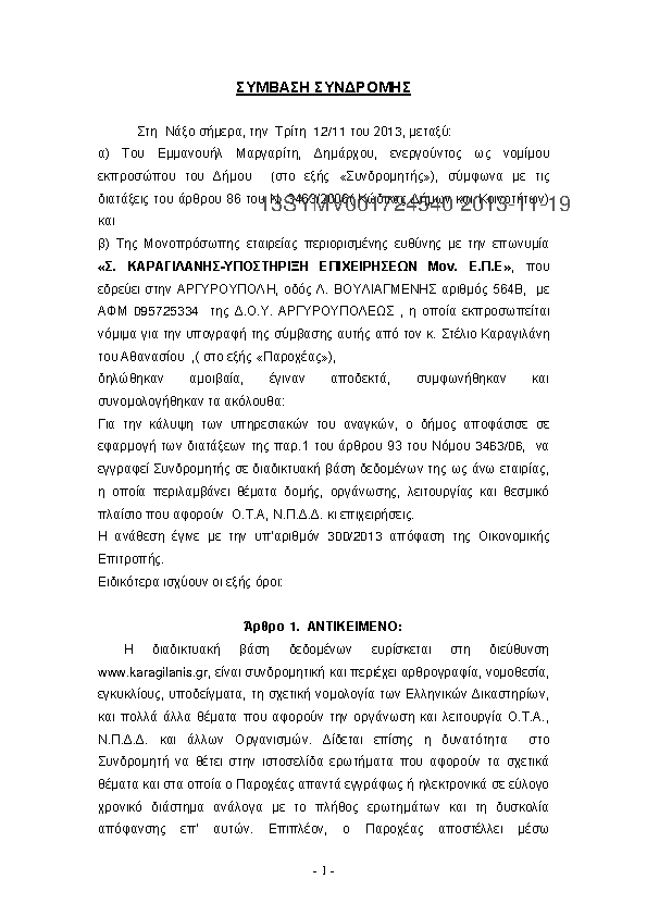 1. Ετήσια συνδρομή 2013 για υπηρεσίες μέσω δικτυακής βάσης δεδομένων στην Σ. Καραγιλάνης