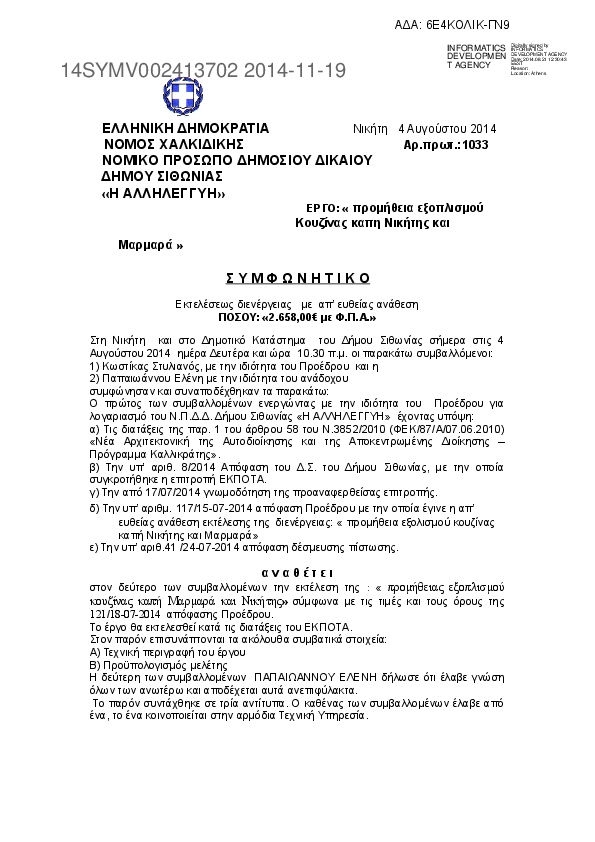 1. ΣΥΜΦΩΝΗΤΙΚΟ ΠΡΟΜΗΘΕΙΑΣ ΕΞΟΠΛΙΣΜΟΥ ΚΟΥΖΙΝΑΣ ΚΑΠΗ ΝΙΚΗΤΗΣ ΚΑΙ ΝΕΟΥ ΜΑΡΜΑΡΑ