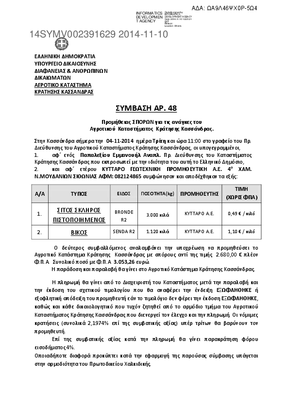 1. ΣΥΜΒΑΣΗ ΠΡΟΜΗΘΕΙΑΣ ΣΠΟΡΩΝ ΓΙΑ ΤΟ Α.Κ.Κ.ΚΑΣΣΑΝΔΡΑΣ ΑΠΟ ΚΥΤΤΑΡΟ ΓΕΩΤΕΧΝΙΚΗ ΠΡΟΜΗΘΕΥΤΙΚΗ Α.Ε.