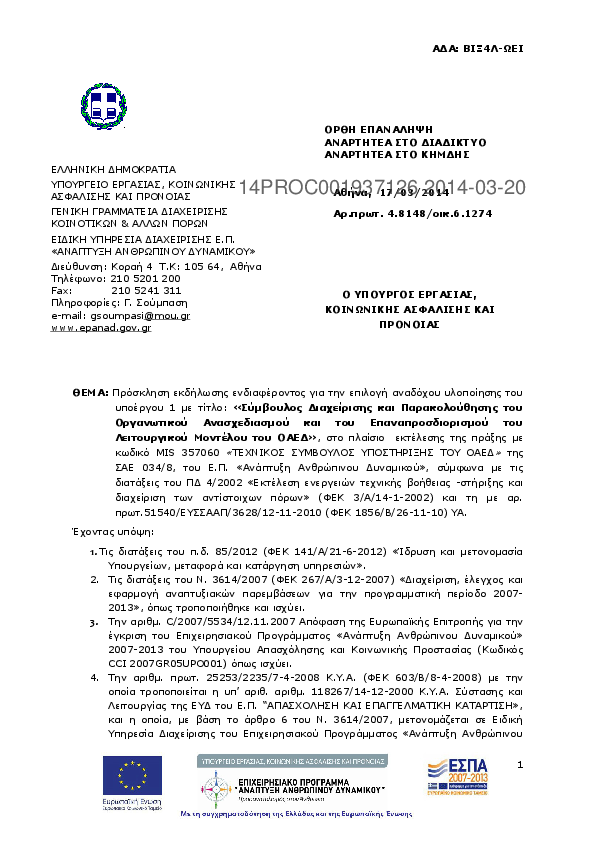 5. "Πρόσκληση εκδήλωσης ενδιαφέροντος για την επιλογή αναδόχου υλοποίησης του υποέργου 1 με τίτλο: «Σύμβουλος Διαχείρισης και Παρακολούθησης του Οργανωτικού Ανασχεδιασμού και του Επαναπροσδιορισμού του Λειτουργικού Μοντέλου του ΟΑΕΔ», στο π...
