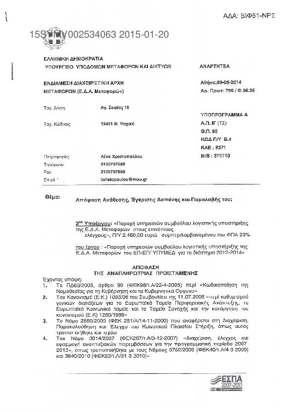 8. ΑΝΑΘΕΣΗΣ ΠΑΡΟΧΗΣ ΥΠΗΡΕΣΙΩΝ ΤΕΧΝΙΚΟΥ ΣΥΜΒΟΥΛΟΥ ΓΙΑ ΤΗΝ ΥΠΟΣΤΗΡΙΞΗ ΤΗΣ Δ1 & ΤΩΝ ΣΥΝΑΡΜΟΔΙΩΝ ΥΠΗΡΕΣΙΩΝ