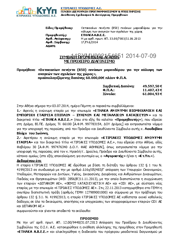 3. ΣΥΜΒΑΣΗ ΠΡΟΜΗΘΕΙΑΣ 850 ΠΙΝΑΚΩΝ ΜΑΡΚΑΔΟΡΟΥ
