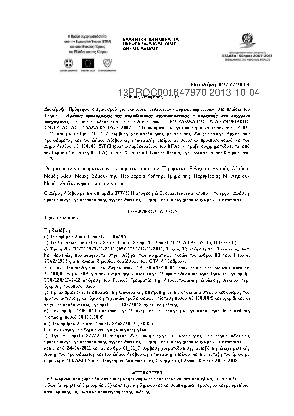 2. Περίληψη Διακήρυξης Διαγωνισμού για την αγορά επιλεγμένων κεραμικών δημιουργιών στα πλαίσια του Έργου : «Δράσεις προσαρμογής της παραδοσιακής αγγειοπλαστικής