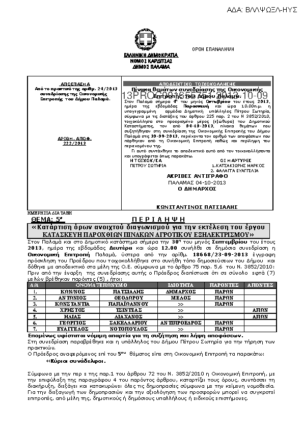 6. ΟΡΘΗ ΕΠΑΝΑΛΗΨΗ ΤΗΣ ΥΠ' ΑΡΙΘΜΟΝ 222/2013 ΑΠΟΦΑΣΗΣ ΤΗΣ ΟΙΚΟΝΟΜΙΚΗΣ ΕΠΙΤΡΟΠΗΣ ΠΕΡΙ ΚΑΤΑΡΤΙΣΗΣ ΟΡΩΝ ΑΝΟΙΧΤΟΥ ΔΙΑΓΩΝΙΣΜΟΥ ΓΙΑ ΤΗΝ ΕΚΤΕΛΕΣΗ ΤΟΥ ΕΡΓΟΥ ΚΑΤΑΣΚΕΥΗ ΠΑΡΟΧΘΙΩΝ ΠΙΝΑΚΩΝ ΑΓΡΟΤΙΚΟΥ ΕΞΗΛΕΚΤΡΙΣΜΟΥ