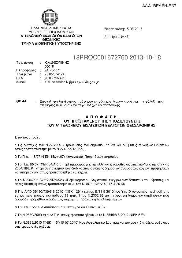 1. Επανάληψη διενέργειας πρόχειρου μειοδοτικού διαγωνισμού για την φύλαξη της αποθήκης που βρίσκεται στην Πολίχνη Θεσσαλονίκης