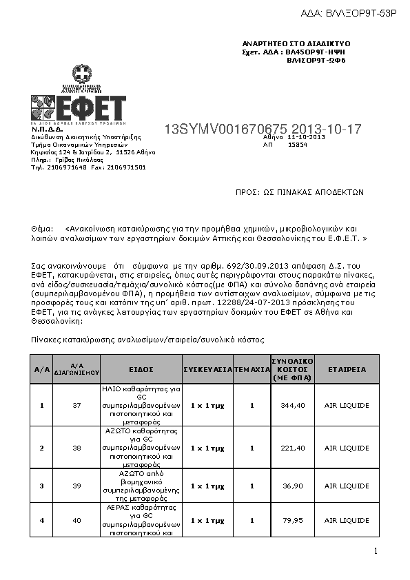 9. Ανακοίνωση κατακύρωσης για την προμήθεια χημικών, μικροβιολογικών και λοιπών αναλωσίμων των εργαστηρ