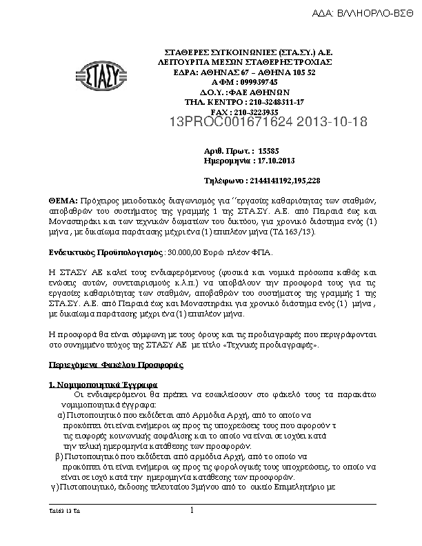 9. Πρόχειρος μειοδοτικός διαγωνισμός για ‘’εργασίες καθαριότητας των σταθμών, αποβαθρών του συστήματος της γραμμής 1 της ΣΤΑ.ΣΥ. Α.Ε. από Ομόνοια έως και Περισσό για χρονικό διάστημα ενός (1) μήνα , με δικαίωμα παράτασης μέχρι ένα (1) επιπλ...