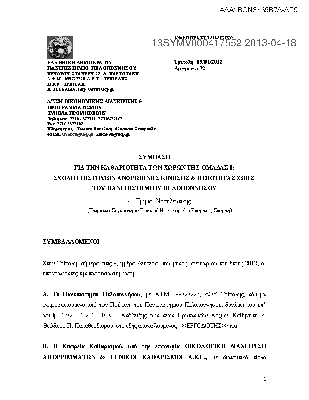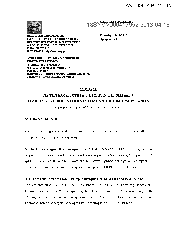 1. ΣΥΜΒΑΣΗ ΚΑΘΑΡΙΟΤΗΤΑΣ ΓΡΑΦΕΙΩΝ ΠΑΝΕΠΙΣΤΗΜΙΟΥ ΠΕΛΟΠΟΝΝΗΣΟΥ ΣΤΗΝ ΑΘΗΝΑ