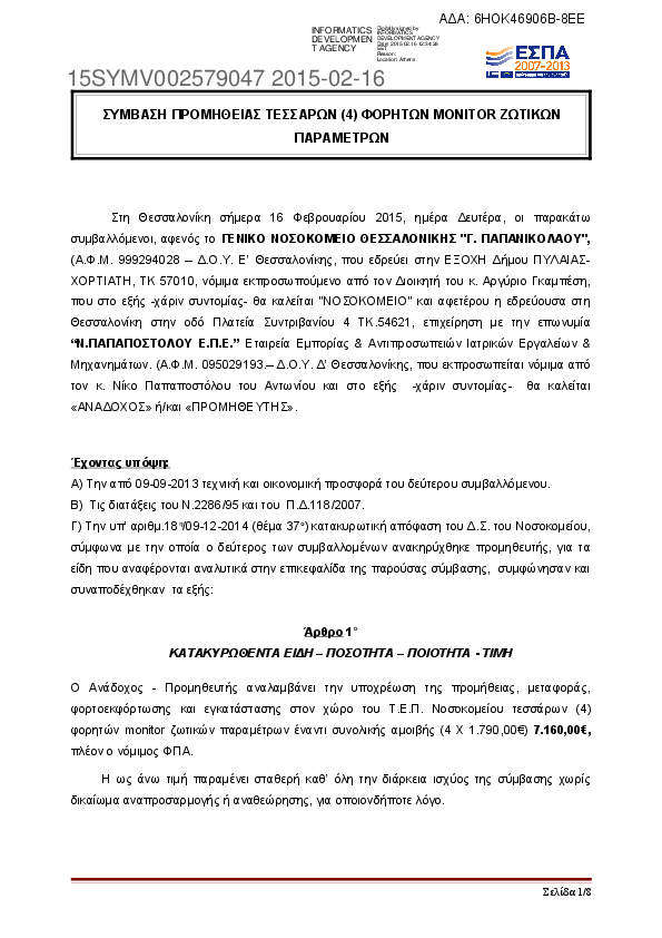 2. ΣΥΜΒΑΣΗ ΠΡΟΜΗΘΕΙΑΣ ΤΕΣΣΑΡΩΝ (4) ΦΟΡΗΤΩΝ ΜΟΝΙΤΟR ΖΩΤΙΚΩΝ ΠΑΡΑΜΕΤΡΩΝ ΜΕ ΕΤΑΙΡΕΙΑ "Ν. ΠΑΠΑΠΟΣΤΟΛΟΥ ΕΠΕ"