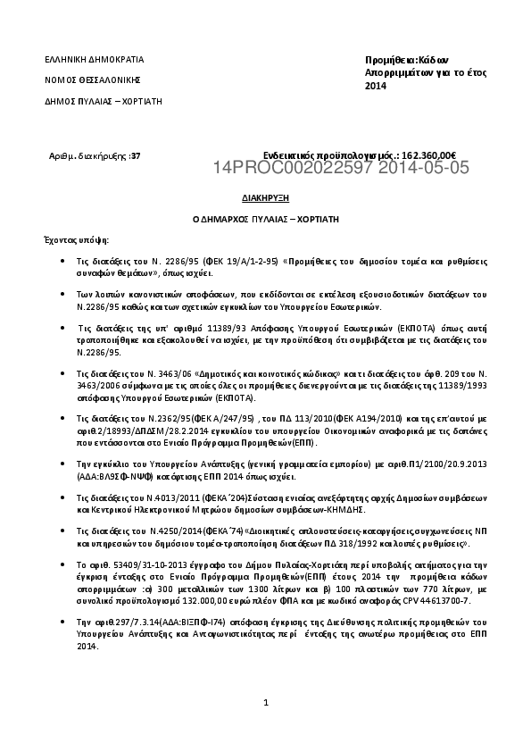 3. Διακήρυξη για την προμήθεια «Κάδων απορριμμάτων για το έτος 2014»,