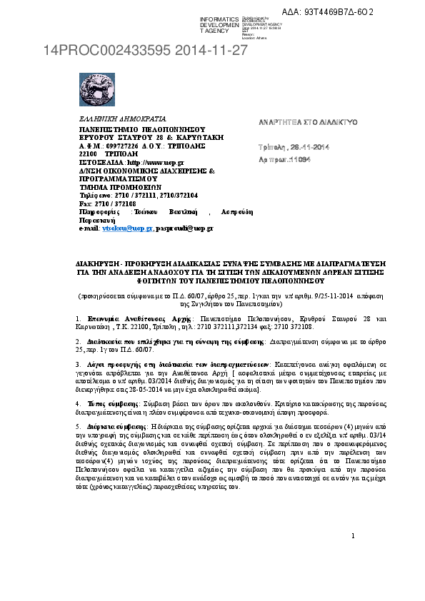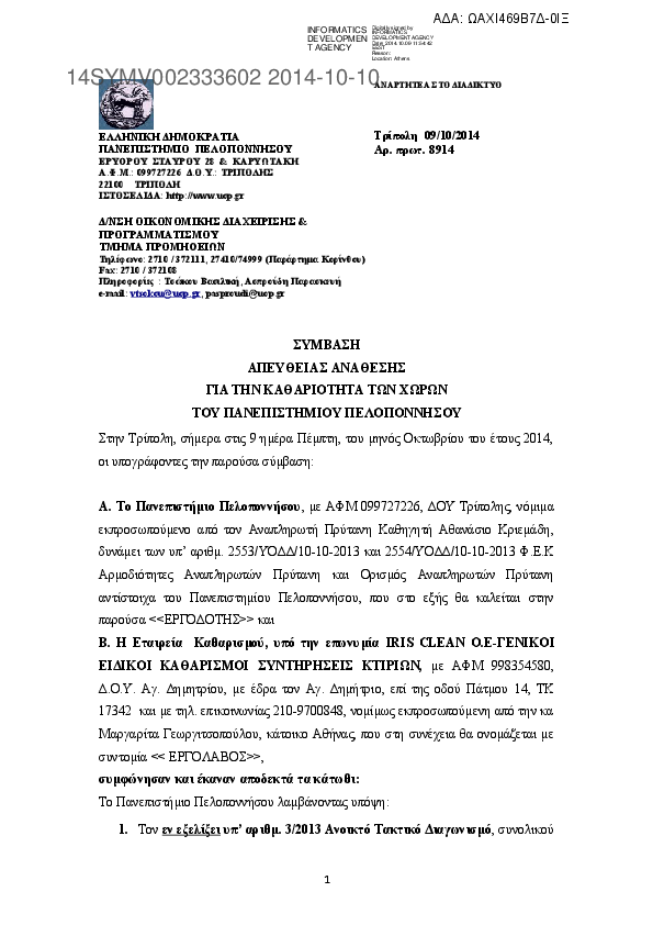 1. ΣΥΜΒΑΣΗ ΑΠΕΥΘΕΙΑΣ ΑΝΑΘΕΣΗΣ ΓΙΑ ΤΗΝ ΚΑΘΑΡΙΟΤΗΤΑ ΤΩΝ ΧΩΡΩΝ ΤΟΥ ΠΑΝΕΠΙΣΤΗΜΙΟΥ ΠΕΛΟΠΟΝΝΗΣΟΥ