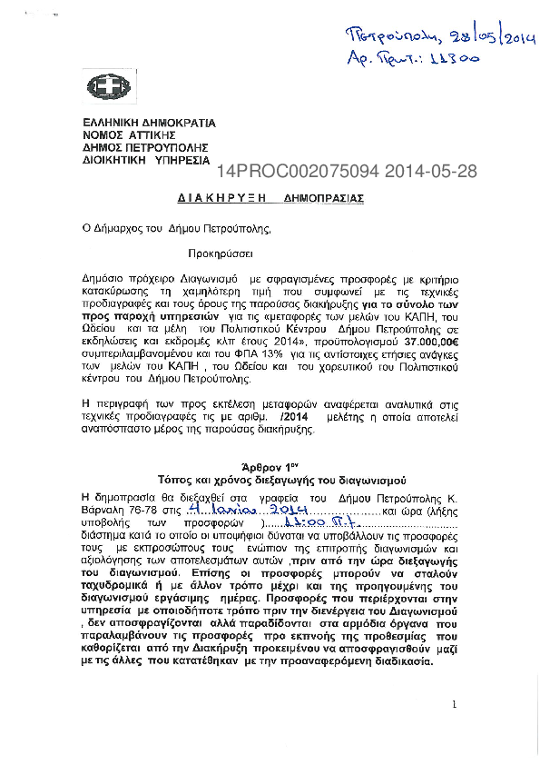 1. ΠΕΡΙΛΗΨΗ ΔΙΑΚΗΡΥΞΗΣ ΠΡΟΧΕΙΡΟΥ ΔΙΑΓΩΝΙΣΜΟΥ ΓΙΑ ΤΗΝ ΜΙΣΘΩΣΗ ΜΕΤΑΦΟΡΙΚΩΝ ΜΕΣΩΝ