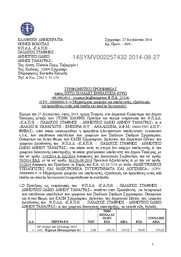 1. ΠΡΟΜΗΘΕΙΑ ΗΛΕΚΤΡΟΝΙΚΩΝ ΥΠΟΛΟΓΙΣΤΩΝ ΚΑΙ ΕΚΤΥΠΩΤΩΝ ΓΙΑ ΤΟ Ν.Π.Δ.Δ. ΔΗΜΟΥ ΤΑΝΑΓΡΑΣ