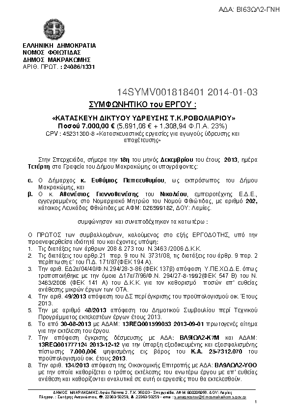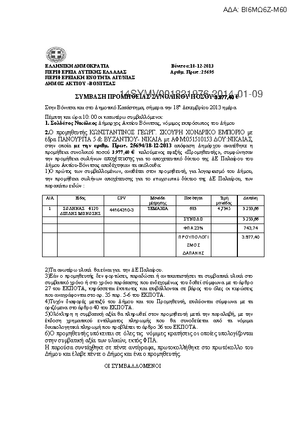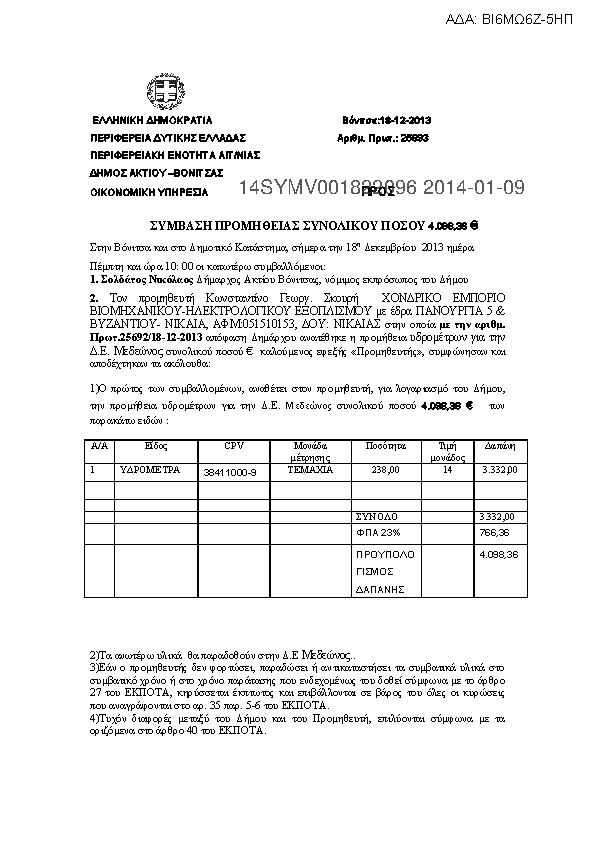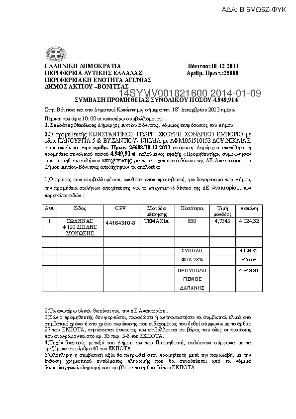 9. ΣΥΜΒΑΣΗ ΠΡΟΜΗΘΕΙΑΣ ΣΩΛΗΝΩΝ ΑΠΟΧΕΤΕΥΣΗΣ ΓΙΑ ΤΗΝ ΔΕ ΠΑΛΑΙΡΟΥ ΤΟΥ ΔΗΜΟΥ ΑΚΤΙΟΥ ΒΟΝΙΤΣΑΣ