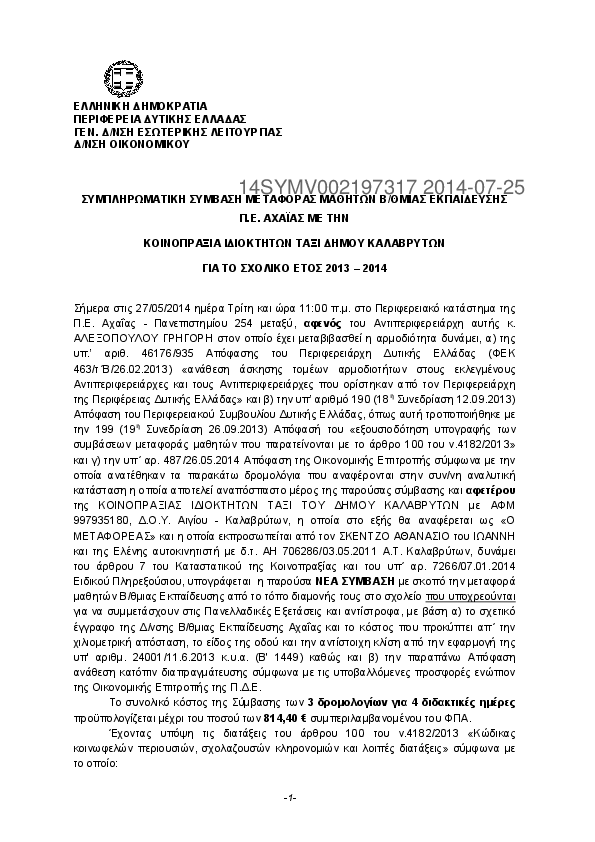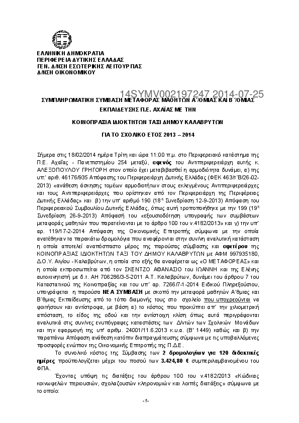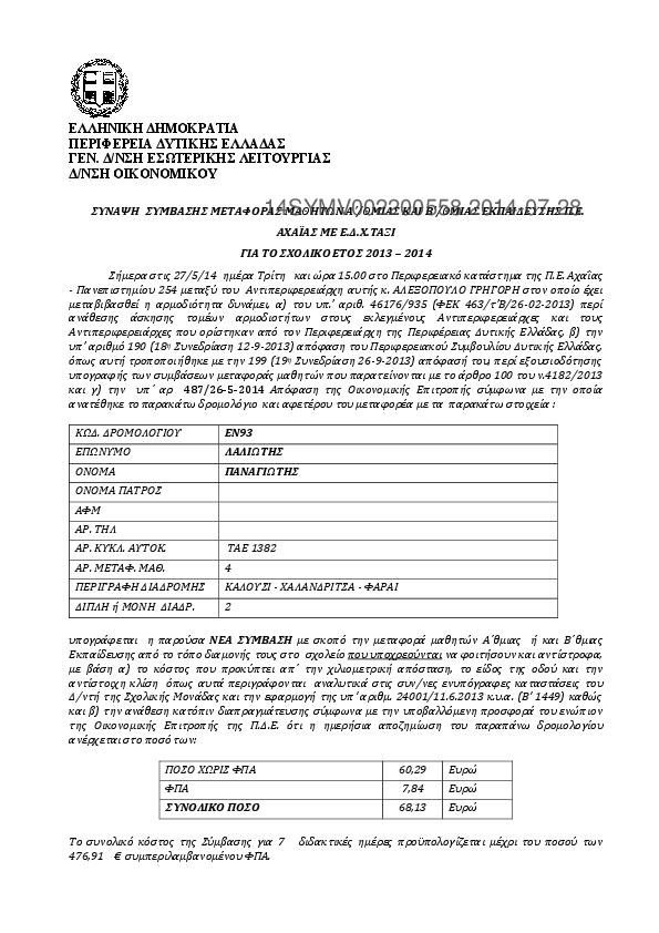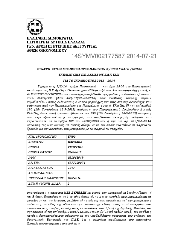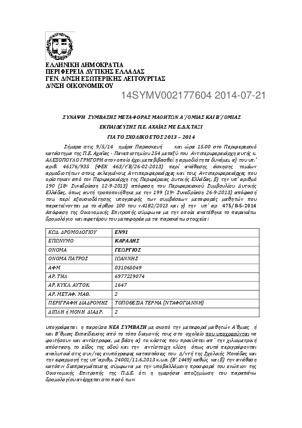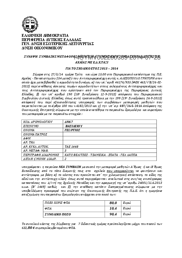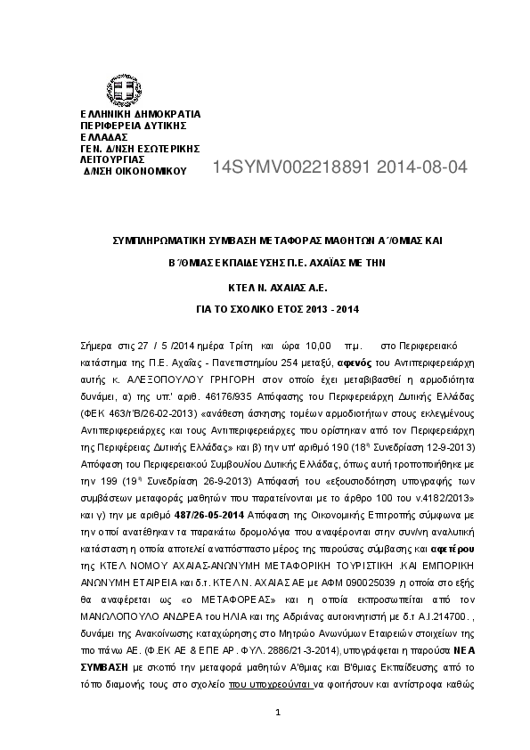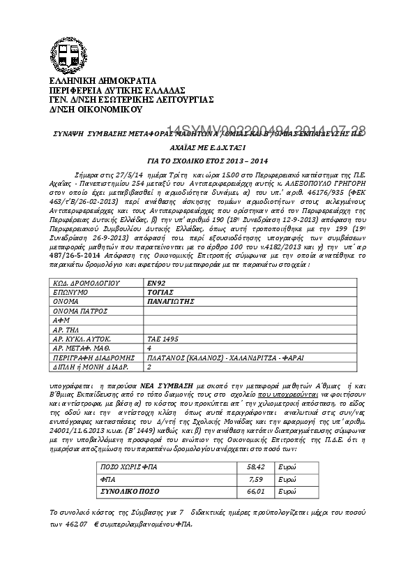4. ΣΥΜΠΛΗΡΩΜΑΤΙΚΗ ΣΥΜΒΑΣΗ ΜΕΤΑΦΟΡΑΣ ΜΑΘΗΤΩΝ Α΄/ΘΜΙΑΣ ΚΑΙ Β΄/ΘΜΙΑΣ ΕΚΠΑΙΔΕΥΣΗΣ Π.Ε. ΑΧΑΪΑΣ ΜΕ ΤΗΝ ΚΟΙΝΟΠ