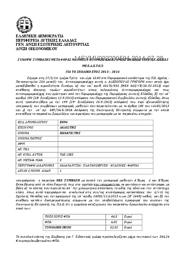 5. ΣΥΝΑΨΗ ΣΥΜΒΑΣΗΣ ΜΕΤΑΦΟΡΑΣ ΜΑΘΗΤΩΝ Α΄/ΘΜΙΑΣ ΚΑΙ Β΄/ΘΜΙΑΣ ΕΚΠΑΙΔΕΥΣΗΣ Π.Ε. ΑΧΑΪΑΣ ΜΕ Ε.Δ.Χ.ΤΑΞΙ ΓΙΑ Τ