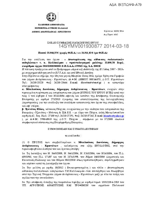 2. ΣΥΜΒΑΣΗ ΤΟΥ ΕΡΓΟΥ ΑΠΟΠΕΡΑΤΩΣΗ ΤΗΣ ΑΙΘΟΥΣΑΣ ΠΟΛΙΤΙΣΤΙΚΩΝ ΕΚΔΗΛΩΣΕΩΝ Τ.Κ ΚΑΛΛΙΚΩΜΟΥ