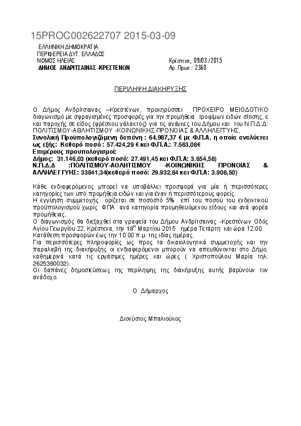 10. ΠΕΡΙΛΗΨΗ ΔΙΑΚΗΡΥΞΗΣ ΓΙΑ ΤΗΝ ΠΡΟΜΗΘΕΙΑ ΕΙΔΩΝ ΤΡΟΦΙΜΩΝ 2015