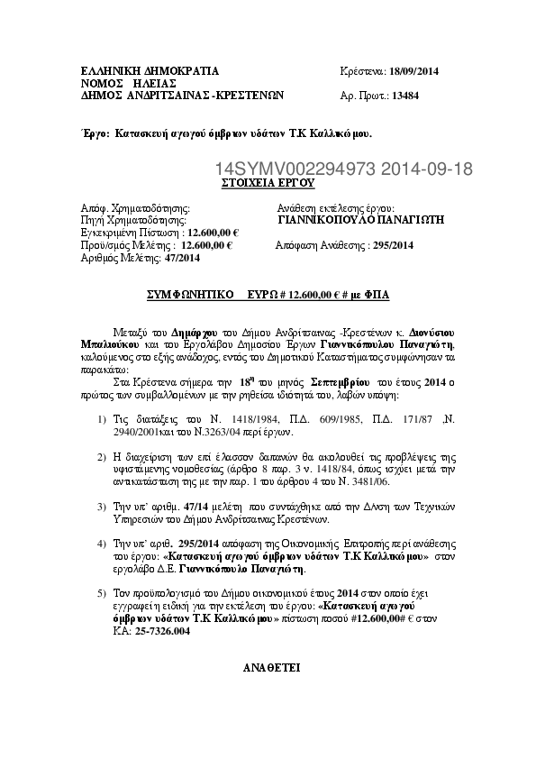 6. ΣΥΜΦΩΝΗΤΙΚΟ ΓΙΑ ΤΟ ΕΡΓΟ ΚΑΤΑΣΚΕΥΗ ΑΓΩΓΟΥ ΟΜΒΡΙΩΝ ΥΔΑΤΩΝ Τ.Κ ΚΑΛΛΙΚΩΜΟΥ