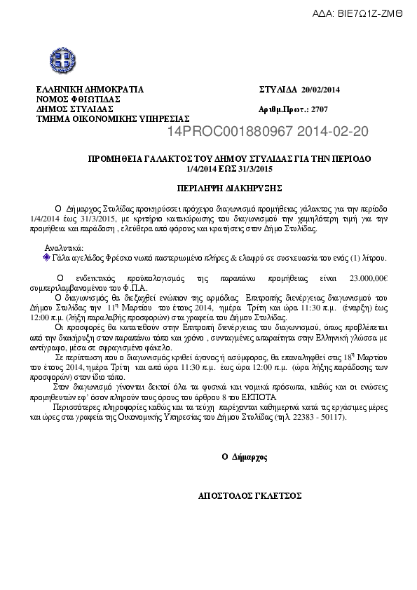 5. ΠΕΡΙΛΗΨΗ ΔΙΑΚΗΡΥΞΗΣ ΓΙΑ ΤΗΝ ΠΡΟΜΗΘΕΙΑ ΓΑΛΑΚΤΟΣ ΤΟΥ ΔΗΜΟΥ ΣΤΥΛΙΔΑΣ ΓΙΑ ΤΗΝ ΠΕΡΙΟΔΟ 1/4/2014 ΕΩΣ 31/3/2015.