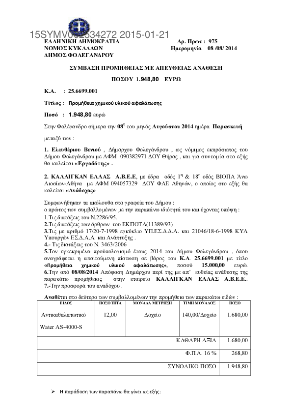 1. Προμήθεια χημικού υλικού αφαλάτωσης