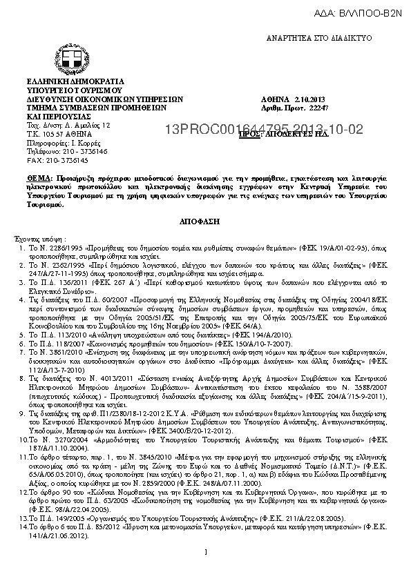1. Προκήρυξη πρόχειρου μειοδοτικού διαγωνισμού για την προμήθεια, εγκατάσταση και λειτουργία ηλεκτρονικού πρωτοκόλλου και ηλεκτρονικής διακίνησης εγγράφων στην Κεντρική Υπηρεσία του Υπουργείου Τουρισμού με τη χρήση ψηφιακών υπογραφών για τι...