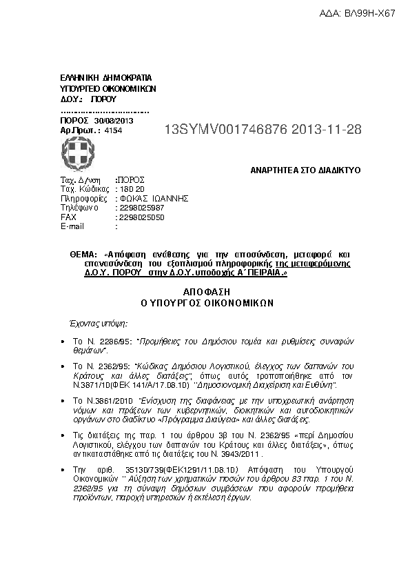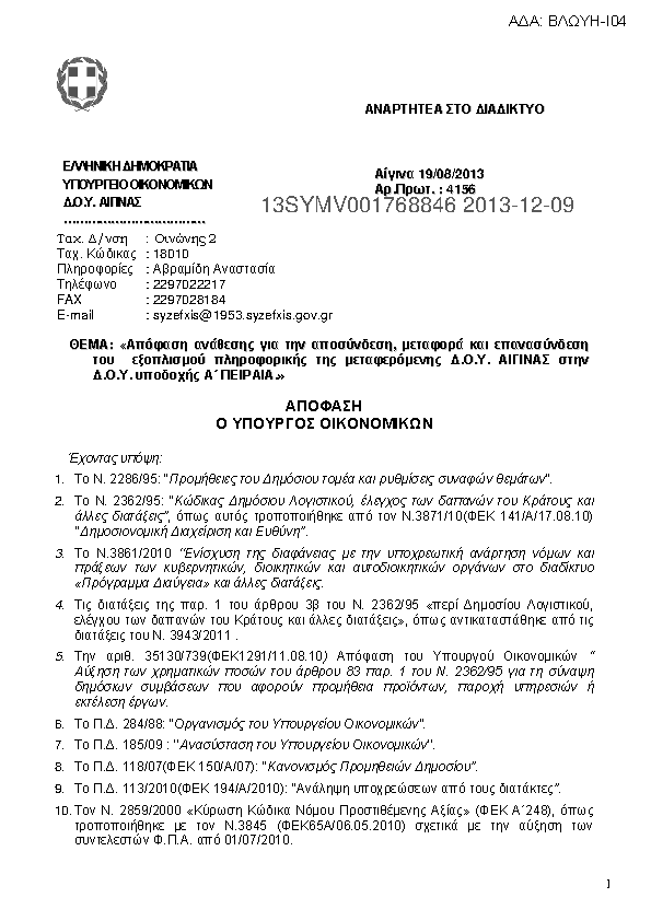1. ΑΠΟΣΥΝΔΕΣΗ,ΜΕΤΑΦΟΡΑ ΚΑΙ ΕΠΑΝΑΣΥΝΔΕΣΗ ΕΞΟΠΛΙΣΜΟΥ ΠΛΗΡΟΦΟΡΙΚΗΣ ΔΟΥ ΑΙΓΙΝΑΣ ΣΤΗΝ ΔΟΥ Α' ΠΕΙΡΑΙΑ