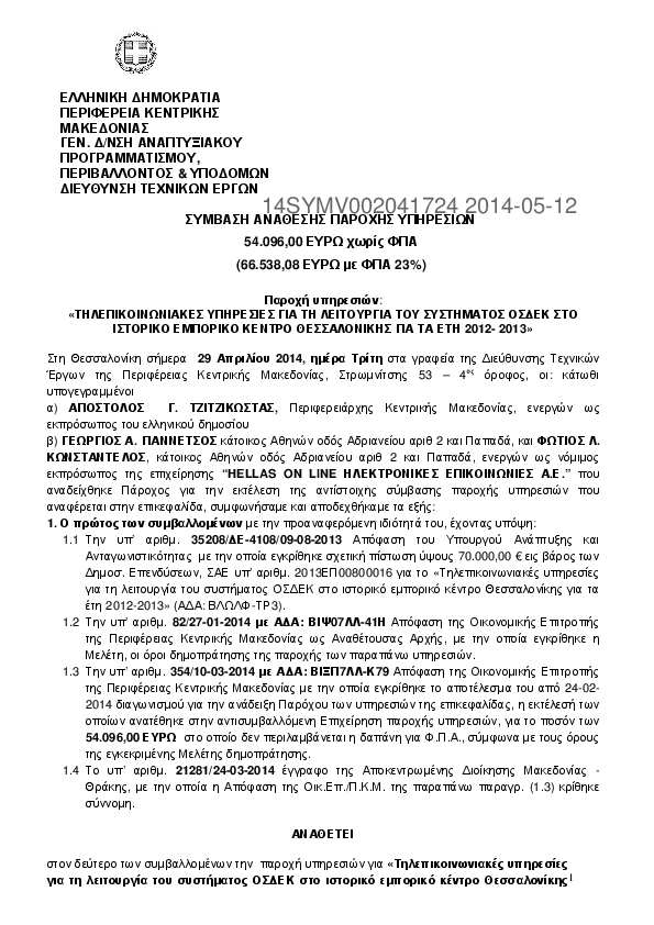 1. «ΤΗΛΕΠΙΚΟΙΝΩΝΙΑΚΕΣ ΥΠΗΡΕΣΙΕΣ ΓΙΑ ΤΗ ΛΕΙΤΟΥΡΓΙΑ ΤΟΥ ΣΥΣΤΗΜΑΤΟΣ ΟΣΔΕΚ ΣΤΟ ΙΣΤΟΡΙΚΟ ΕΜΠΟΡΙΚΟ ΚΕΝΤΡΟ ΘΕΣ