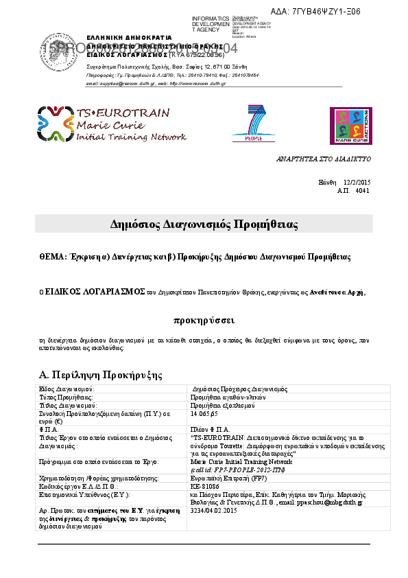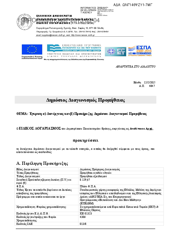 1. Διακήρυξη πρόχειρου διαγωνισμού προμήθειας και εγκατάστασης τεχνολογικού εξοπλισμού του Τ.Ε.Φ.Α.Α.