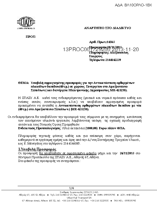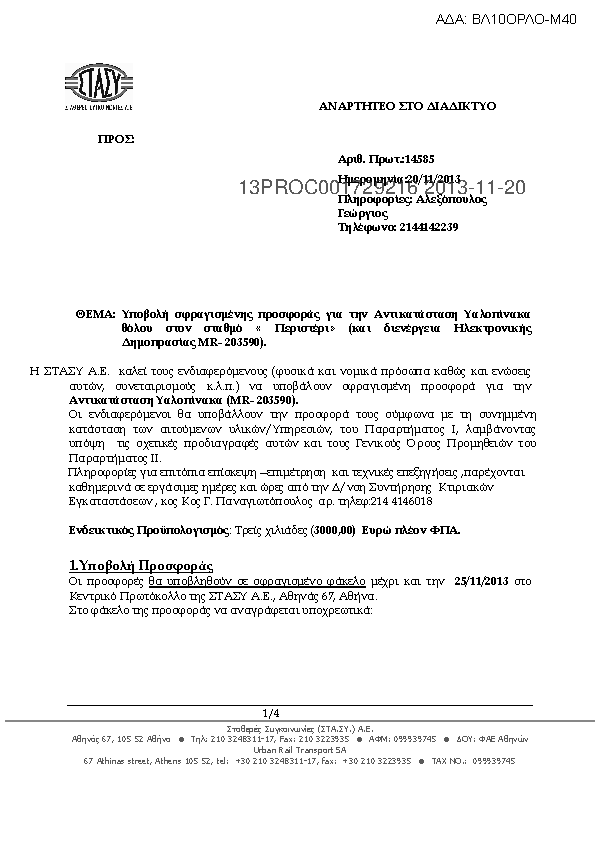 6. Υποβολή σφραγισμένης προσφοράς για την Αντικατάσταση Υαλοπίνακα θόλου στον σταθμό «Περιστέρι» (και διενέργεια Ηλεκτρονικής Δημοπρασίας MR