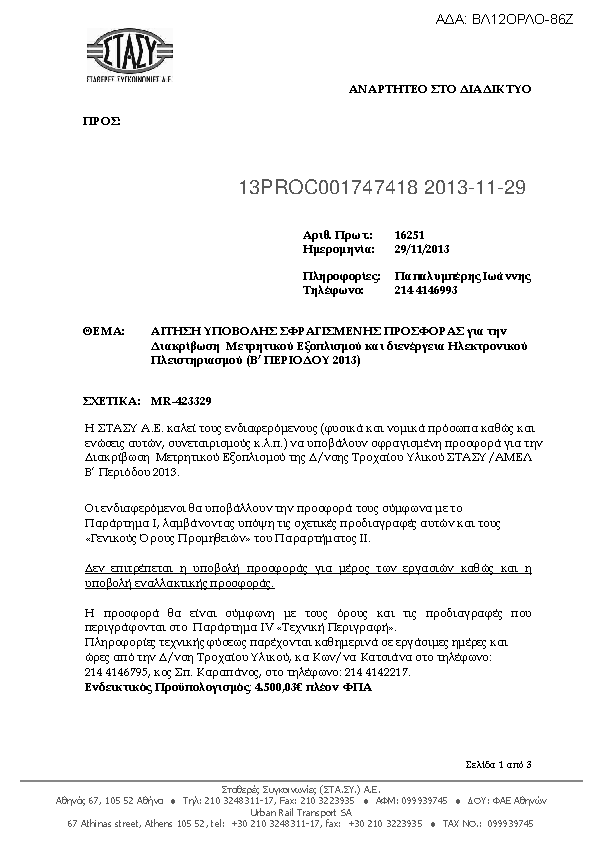 5. Υποβολή σφραγισμένης προσφοράς για την Προμήθεια Συστοιχίας Επαναφορτιζόμενων Συσσωρευτών Έλξης.( και διενέργεια Ηλεκτρονικής Δημοπρασίας MR