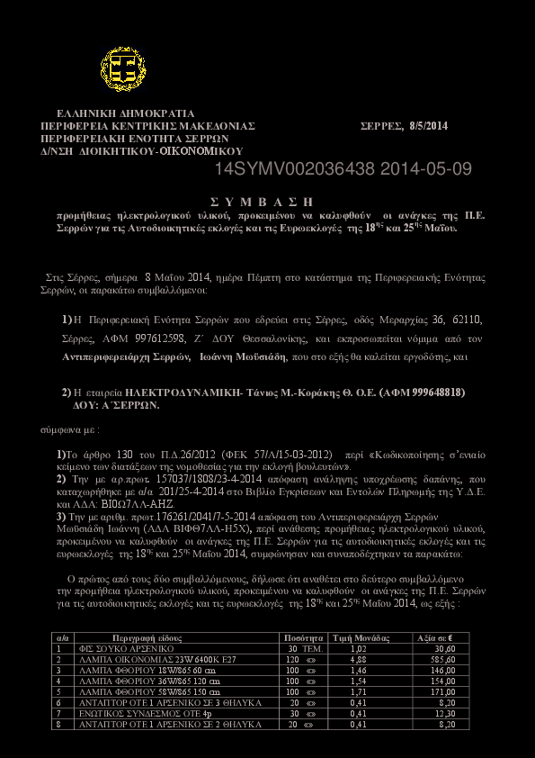 1. ΣΥΜΒΑΣΗ ΠΡΟΜΗΘΕΙΑΣ ΗΛΕΚΤΡΟΛΟΓΙΚΟΥ ΥΛΙΚΟΥ Π.Ε.ΣΕΡΡΩΝ ΓΙΑ ΤΙΣ ΑΝΑΓΚΕΣ ΤΩΝ ΕΚΛΟΓΩΝ ΤΟΥ ΜΑΪΟΥ 2014