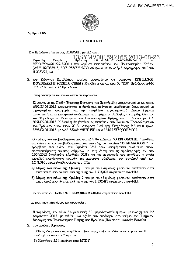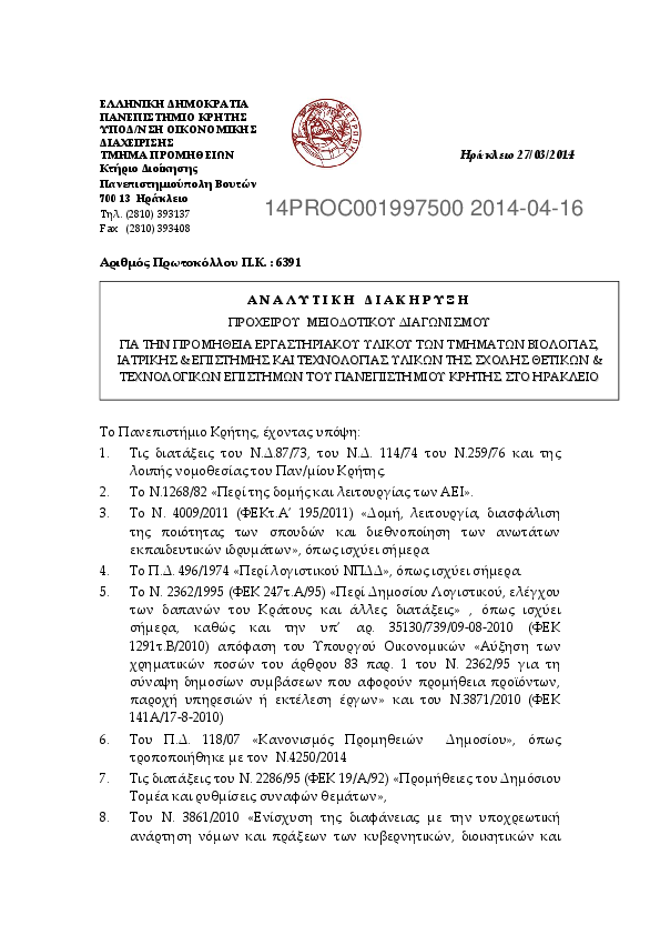 1. Προμήθεια εργαστηριακού υλικού του Τμήματος Βιολογίας του Πανεπιστημίου Κρήτης
