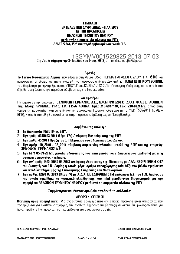 1. ΠΡΟΣΚΛΗΣΗ MINI ΜΕΙΟΔΟΤΙΚΟΥ ΔΙΑΓΩΝΙΣΜΟΥ ΓΙΑ ΤΙΣ ΕΚΤΕΛΕΣΤΙΚΕΣ ΤΗΣ ΣΥΜΦΩΝΙΑΣ ΠΛΑΙΣΙΟΥ ΣΥΜΒΑΣΕΙΣ ΓΙΑ ΤΗΝ ΠΡΟΜΗΘΕΙΑ ΒΕΛΟΝΩΝ ΤΕΧΝΗΤΟΥ ΝΕΦΡΟΥ