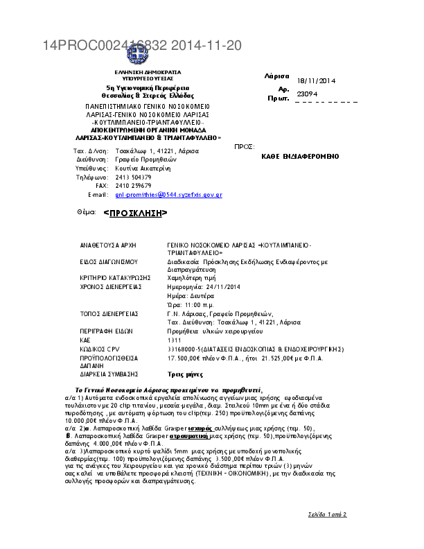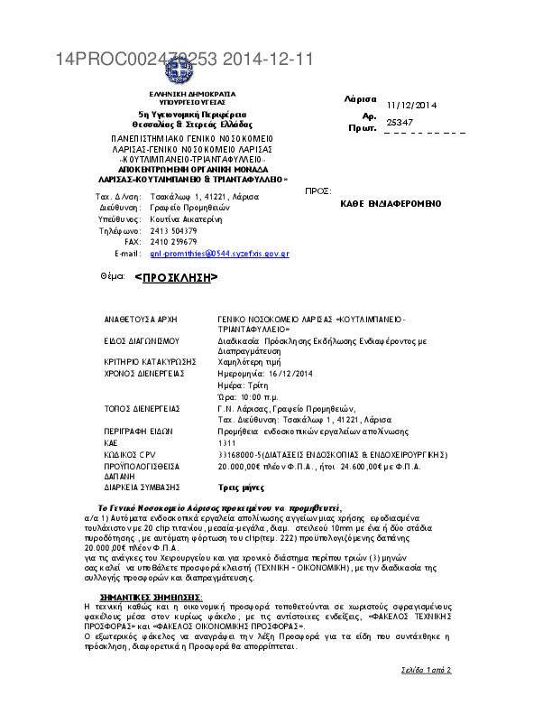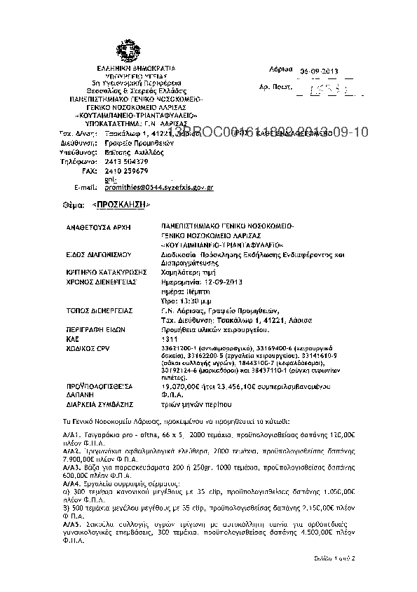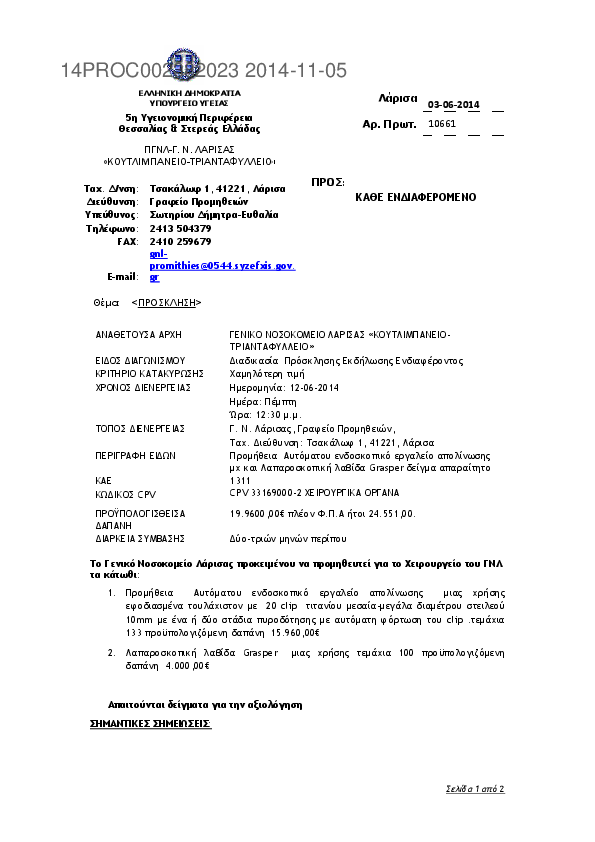 1. ΠΡΟΣΚΛΗΣΗ ΓΙΑ ΤΗΝ ΠΡΟΜΗΘΕΙΑ ΥΛΙΚΩΝ ΧΕΙΡΟΥΡΓΕΙΟΥ
