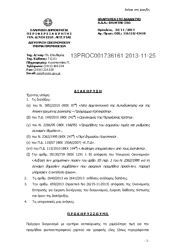 1. Διακήρυξη πρόχειρου διαγωνισμού με κριτήριο κατακύρωσης τη χαμηλότερη τιμή για την προμήθεια φωτοαντιγραφικού χαρτιού και γραφικής ύλης προϋπολογισμού 60.000 € με το ΦΠΑ