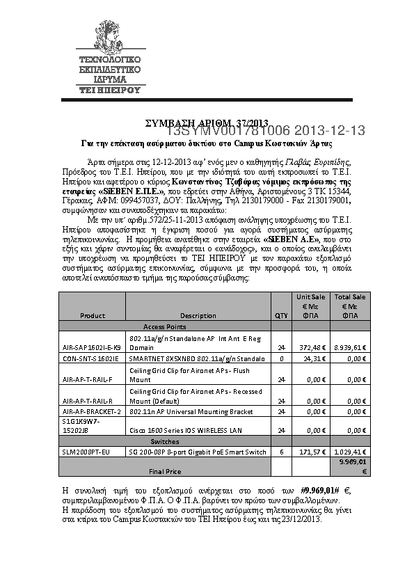 9. Σύμβαση για την επέκταση ασύρματου δικτύου στο Campus Κωστακιών Άρτας