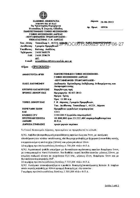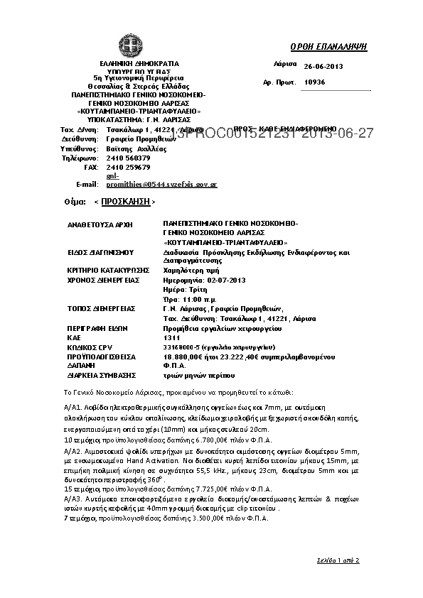 1. ΠΡΟΣΚΛΗΣΗ ΓΙΑ ΤΗΝ ΠΡΟΜΗΘΕΙΑ ΥΛΙΚΩΝ ΧΕΙΡΟΥΡΓΕΙΟΥ