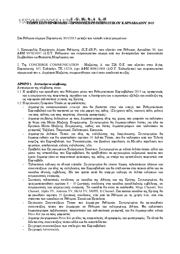 1. ΣΥΜΒΑΣΗ ΥΠΗΡΕΣΙΩΝ ΠΡΟΒΟΛΗΣ – ΠΡΟΩΘΗΣΗ ΡΕΘΕΜΝΙΩΤΙΚΟΥ ΚΑΡΝΑΒΑΛΙΟΥ 2015
