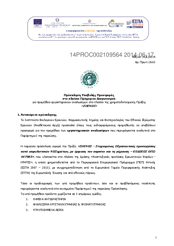 1. Προκήρυξη ανοικτού διαγωνισμού για την επιλογή αναδόχου για τον καθαρισμό των χώρων του Εθνικού Ιδρύματος Ερευνών, επί της Λεωφόρου Βασ. Κωνσταντίνου 48,Αθήνα