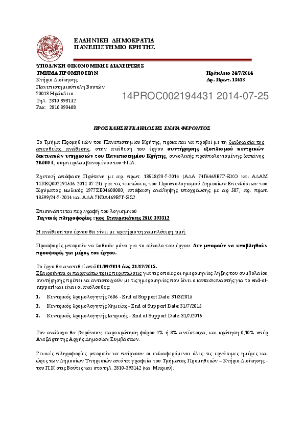 3. Πρόσκληση για ανάθεση έργου συντήρησης εξοπλισμού κεντρικών δικτυακών υπηρεσιών του Π.Κ.