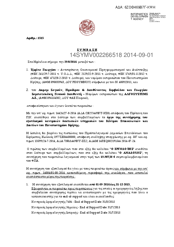 4. Σύμβαση για τη συντήρηση εξοπλισμού κεντρκών δικτυακών υπηρεσιών του ΚΕΔ του Π.Κ.