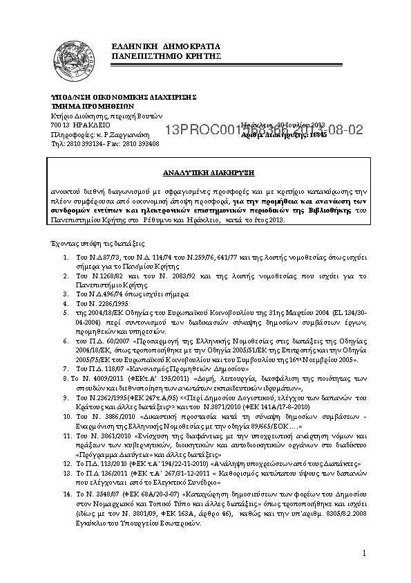 2. Αναλ.Διιακ. για προμήθεια επιστ. περιοδικών εντύπων και ηλεκτρονικών για το έτος 2013 του Παν.Κρήτης