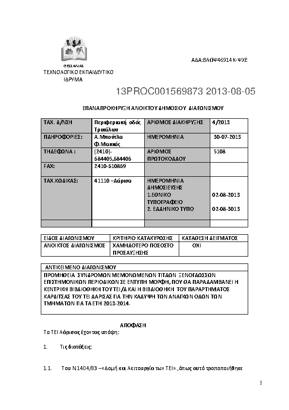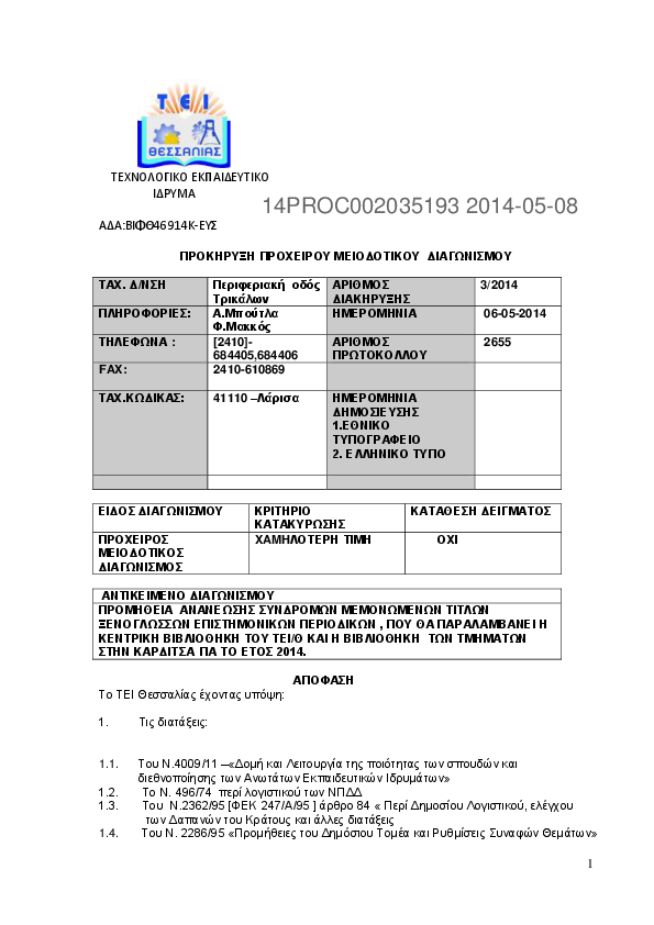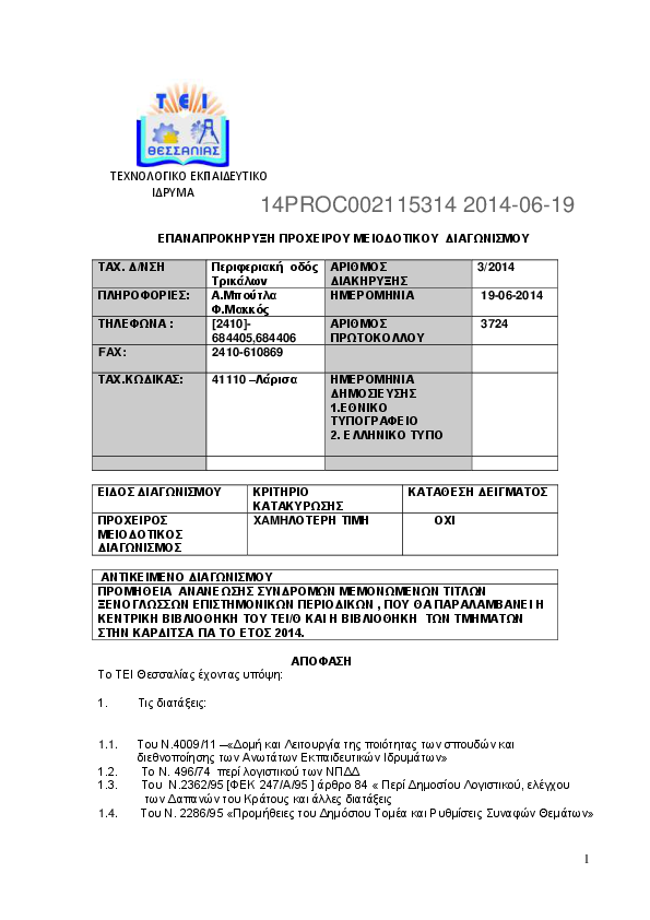 1. EΠΑΝΑΠΡΟΚΗΡΥΞΗ ΓΙΑ ΤΗΝ ΠΡΟΜΗΘΕΙΑ ΣΥΝΔΡΟΜΩΝ ΜΕΜΟΝΩΜΕΝΩΝ ΤΙΤΛΩΝ ΞΕΝΟΓΛΩΣΣΩΝ ΕΠΙΣΤΗΜΟΝΙΚΩΝ ΠΕΡΙΟΔΙΚΩΝ ΣΕ ΕΝΤΥΠΗ MOΡΦΗ, ΠΟΥ ΘΑ ΠΑΡΑΛΑΜΒΑΝΕΙ Η ΚΕΝΤΡΙΚΗ ΒΙΒΛΙΟΘΗΚΗ ΤΟΥ ΤΕΙ/Λ ΚΑΙ Η ΒΙΒΛΙΟΘΗΚΗ ΤΟΥ ΠΑΡΑΡΤΗΜΑΤΟΣ ΚΑΡΔΙΤΣΑΣ ΤΟΥ ΤΕΙ ΛΑΡΙΣΑΣ ΓΙΑ ΤΗΝ Κ...