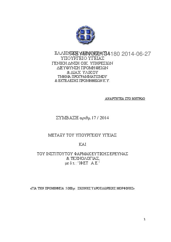 3. Σύμβαση 17/2014 για την προμήθεια 5.000gr σκόνης υδροχλωρικής μορφίνης