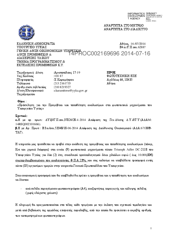 7. Πρόσκληση για την Προμήθεια και τοποθέτηση αναλωσίμων στα φωτοτυπικά μηχανήματα του Υπουργείου Υγεία