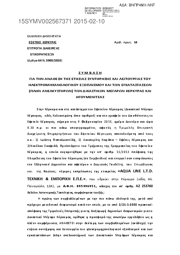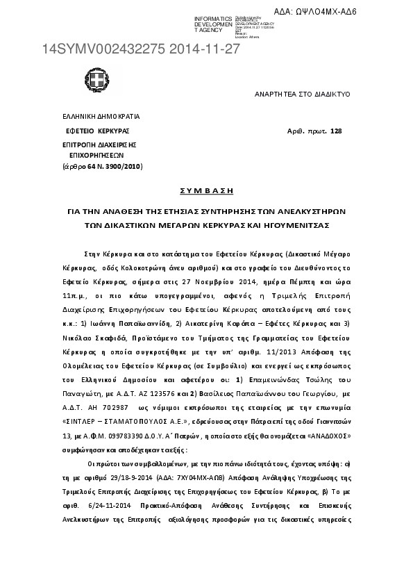 4. Σύμβαση ανάθεσης ετήσιας συντήρησης ανελκυστήρων Δικαστικών Μεγάρων Κέρκυρας και Ηγουμενίτσας
