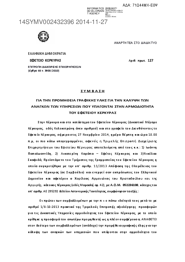 5. Σύμβαση προμήθειας γραφικής ύλης των Δικαστικών Υπηρεσιών αρμοδιότητας Εφετείου Κέρκυρας