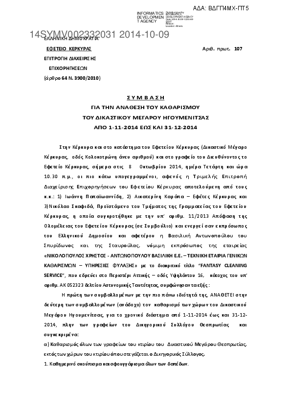 3. Σύμβαση για την ανάθεση του καθαρισμού Δικαστικού Μεγάρου Ηγουμενίτσας από 1-1-2014 έως 31-12-2014